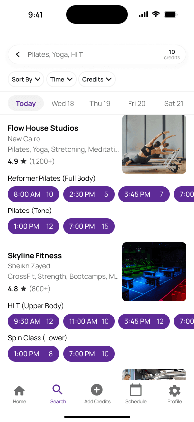 Set your area, time, and workout style to browse a curated mix of studios and classes across Egypt.